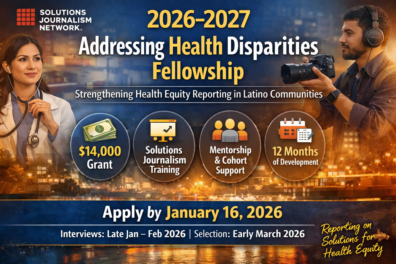 The Solutions Journalism Network (SJN) has announced the opening of applications for its 2026–2027 Addressing Health Disparities Fellowship, a year-long initiative aimed at strengthening newsroom coverage of health equity in Latino communities across the United States.